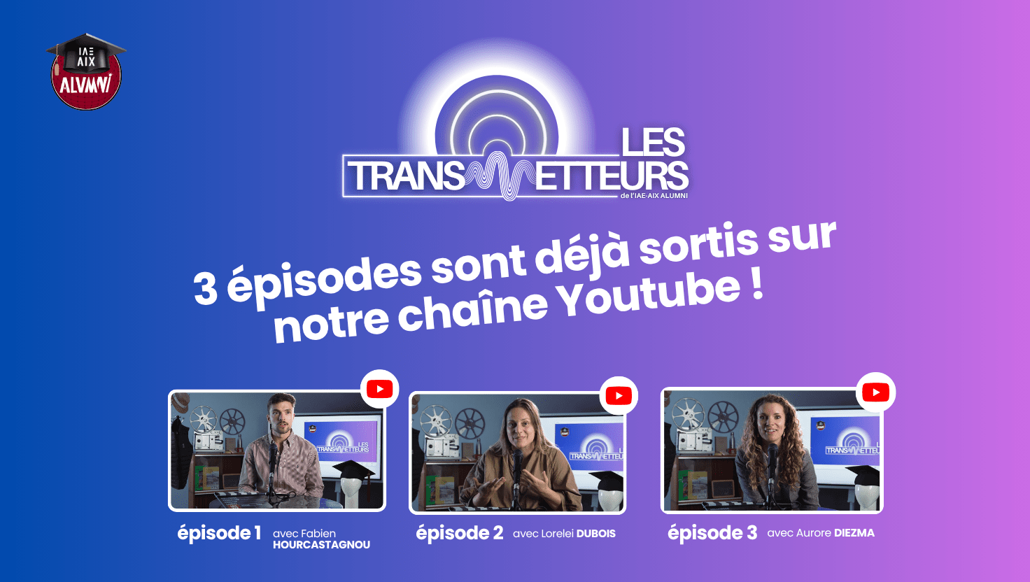 Depuis le lancement de notre podcast officiel de l'association Alumni de l'IAE AIX nous avons sortis 3 vidéos sur notre chaîne Youtube!